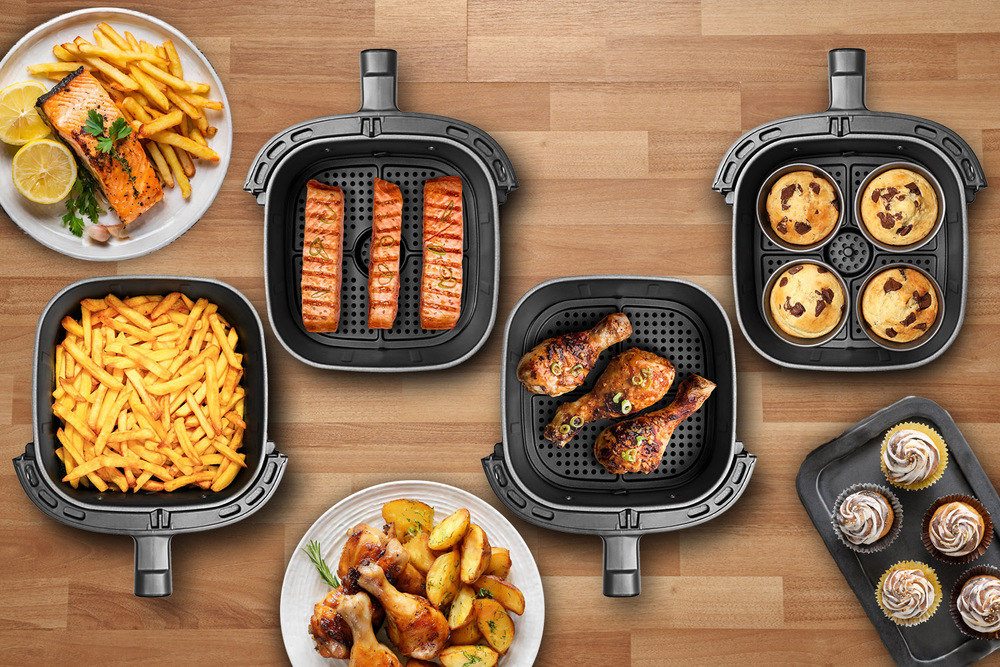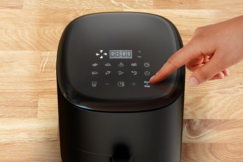 Fritéza má 10 přednastavených programů pro vaření různých pokrmů: hranolky, kuře, steak, ryby, dezert, pizza, nugety, zelenina, krevety a slanina.