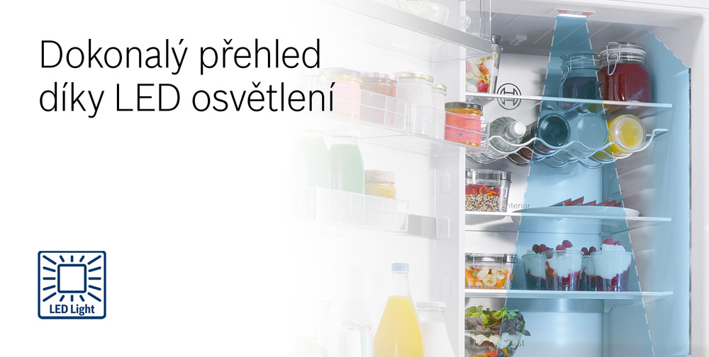 LED světla v chladničce poskytují rovnoměrné a neoslnivé osvětlení celého prostoru. Spotřebují méně energie než konvenční osvětlení chladniček a svítit vydrží po celou dobu životnosti chladničky. To se vyplatí!
