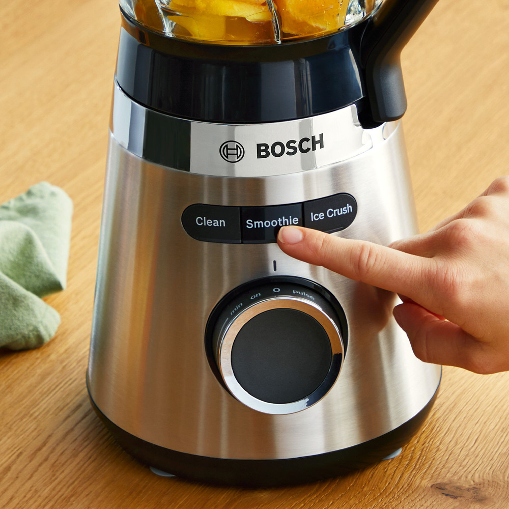 Provoz mixéru je blokován, dokud není správně nasazeno víko. Mixovat do hladka pomáhají vysoce kvalitní nerezové nože ProEdge, Čepele jsou vyráběny v německém městě Solingen, které je proslulé výrobou nožů. Okraje čepelí jsou zpevněny a jejich odolnost je dlouhodobá. Praktický otvor na víku vám umožní rychle a bezpečně přelít hotovou směs do požadovaného nádobí. Vysoká odolnost mixéru je zaručena 100hodinovým testem životnosti, ve kterém bylo připraveno více než 10 000 nádob smoothie. Tento špičkový výkon je dán vysoce kvalitními materiály, evropskou výrobou a mnohaletými zkušenostmi v oboru společnosti Bosch.