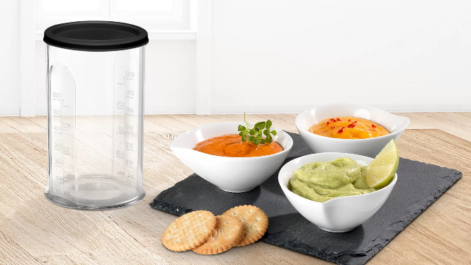 K odměřování a mixování menších dávek se hodí průhledná mixovací nádoba o celkovém objemu 800 ml. Užitný objem a měrka jsou 600 ml. Připravené dresinky a jiné ingredience lze uchovávat v lednici také díky víčku.