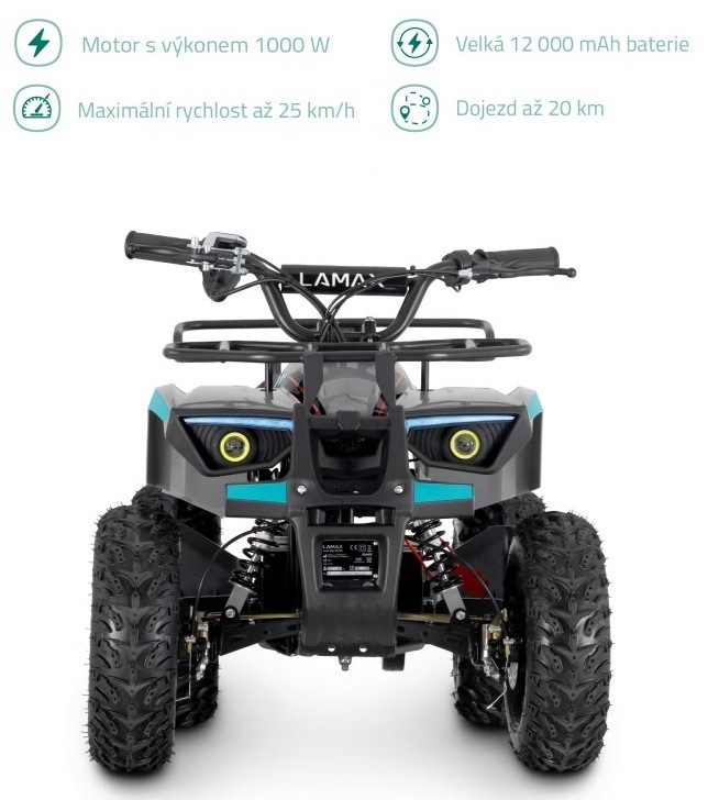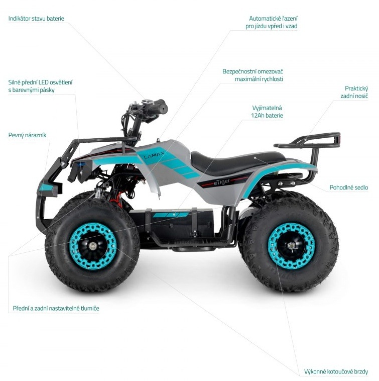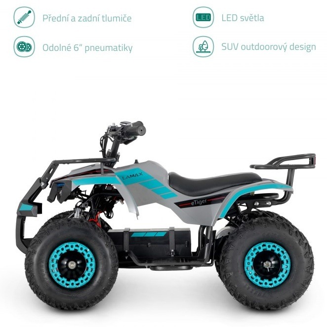 Objevte svět dobrodružství a adrenalinu s elektrickou čtyřkolkou LAMAX eTiger ATV50S Blue. Tato špičková čtyřkolka přináší neomezené možnosti pro zábavu na čerstvém vzduchu. Bez ohledu na to, zda ji bude používat začátečník nebo zkušený jezdec, eTiger ATV50S nadchne svými výkonnými funkcemi a moderním designem. S neskutečným dojezdem až 20 kilometrů se eTiger ATV50S stává spolehlivým společníkem pro dlouhé výlety a objevování terénu. S maximální rychlostí 25 km/h si mohou děti užívat svěžího vánku větru, aniž by byla ohrožena jejich bezpečnost. Čtyřkolka je vybavena elektromotorem o výkonu 1 000 W, což znamená, že si dokáže poradit s různými povrchy – ať už je to asfalt, tráva, hlína, nebo štěrk.