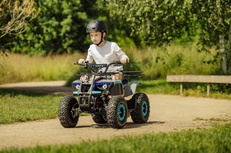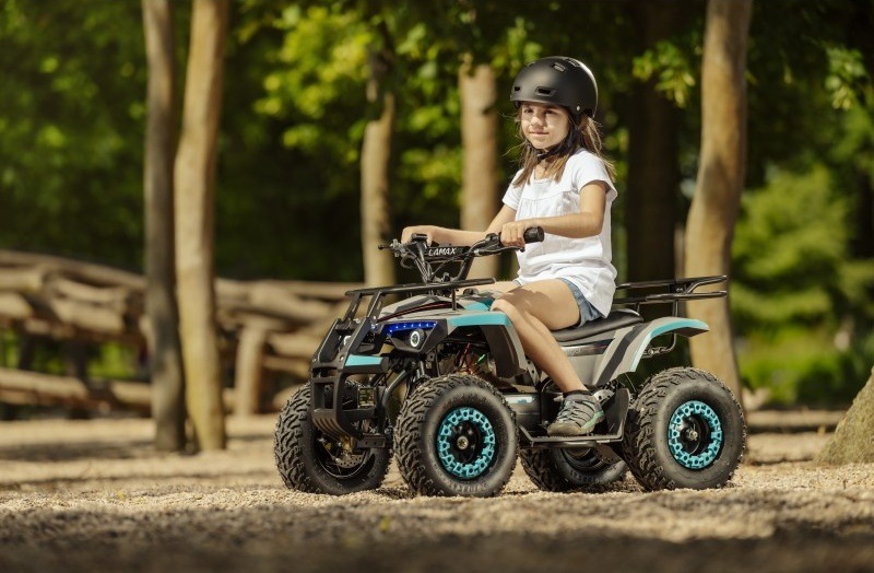 Překonání jakéhokoli terénu ať už je to asfalt, tráva, hlína, nebo štěrk, zvládne díky 1 000W motoru bez problémů. Maximální rychlost 25 km/h je již pořádný tahoun, avšak pokud to rodiče považují za vhodné, mohou rychlost omezit na 6 nebo 15 km/h. Robustní konstrukce a pečlivé zpracování odolávají i hrubšímu zacházení, ale samozřejmě vždy s ohledem na bezpečnost. Nutností je stylová ochranná helma sladěná s barvami čtyřkolky, ať je jízda ještě víc bezstarostná.