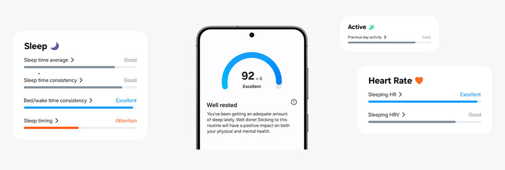 Díky umělé inteligenci Galaxy AI je k dispozici i tzv. Energy skóre. To komplexně sleduje váš spánek, aktivitu i tep a prostřednictvím jediného čísla poskytuje dokonalý přehled o tom, jak na tom jste.