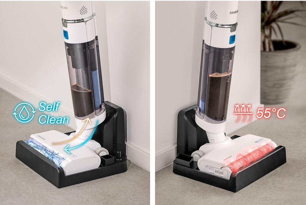 Už žádné ruční čištění kartáče! Funkce Self-Cleaning automaticky pročistí celý systém čističe, včetně kartáče a potrubí. Po dokončení čištění se přístroj v nabíjecí stanici vysuší horkým vzduchem o teplotě 55 °C. Vy si tak můžete být jisti, že při každém použití máte k dispozici dokonale čistý přístroj bez bakterií a nepříjemných pachů.