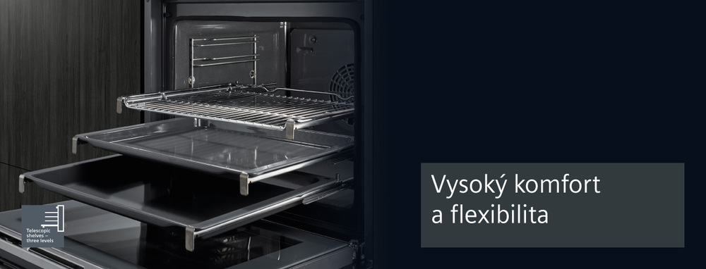 Velký pomocník při pečení je teleskopický výsuv se stop funkcí. Jakýkoli pekáč, plech či zapékací mísu můžete jednoduše a bezpečně vysunout, zkontrolovat a zasunout zpátky do trouby. Tento unikátní teleskopický výsuv můžete umístit do jakékoli úrovně trouby Siemens HQ574AER3.