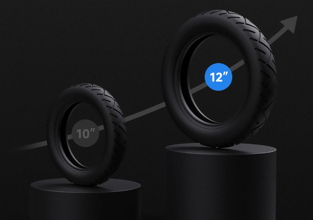 Velké 12palcové bezdušové pneumatiky si s lehkostí poradí i s nerovným terénem a štěrkem, stejně jako zajišťují lepší trakci a stabilitu.