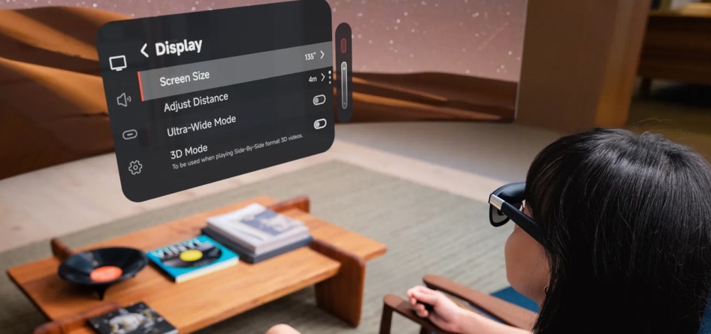 Zobrazený virtuální displej si můžete nastavit podle aktuálních preferencí. Např. během sledování videí si obrazovku snadno upevníte na konkrétní místo, aby zůstala stabilně na místě a nehýbala se ani v případě, že se s brýlemi po prostoru pohybujete.
