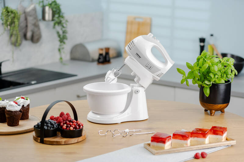 Ergonomická rukojeť usnadní používání tak, abyste všechny ingredience v míse rovnoměrně promíchali. Pokud chcete mít volné obě ruce, vložíte šlehač do stojanu a můžete postupně přidávat další přísady.